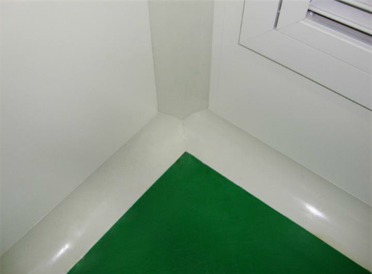 生物潔凈室施工中有一個突出的問題就是圓弧角的使用。生物潔凈室主要以控制細菌等微生物為根本目的,而微生物極易在一些角落里滋生,因此生物潔凈室應(yīng)易于清掃,盡量減少死角,因此在JGJ71-90《潔凈室施工及驗收規(guī)范中》的第2.3.8條規(guī)定:踢腳板部分施工時應(yīng)與墻面齊平或略縮進2~3mm。當(dāng)踢腳板與地面材料相同時可做成小圓角,其圓角半徑R應(yīng)大于等于50mm;當(dāng)踢腳板與地面材料不同時,應(yīng)用彈性材料嵌固。